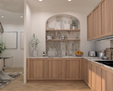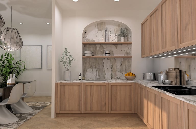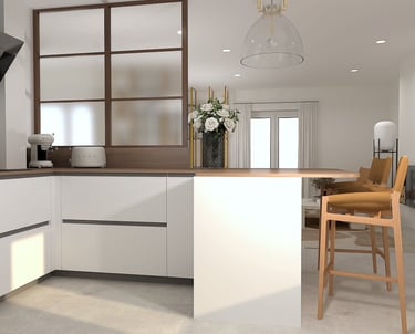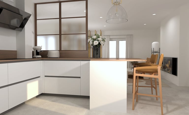 Cette visualisation 3D met en scène une cuisine ouverte subtilement intégrée à la pièce à vivre, pensée pour favoriser les échanges et la fluidité des déplacements.