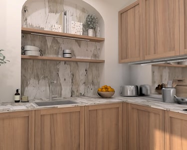 Cette 3D illustre la conception sur mesure d’un espace raffiné, où la pureté des lignes rencontre la chaleur des matières