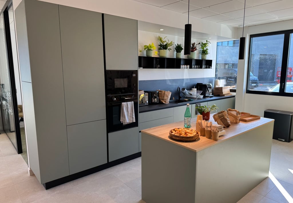 Nous avons conçu et réalisé cette cuisine au design épuré et fonctionnel pour un espace professionnel lumineux.