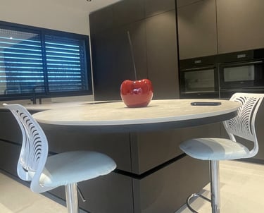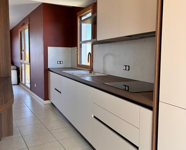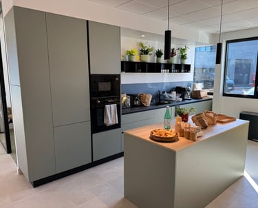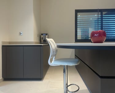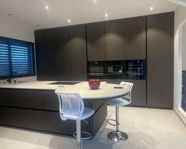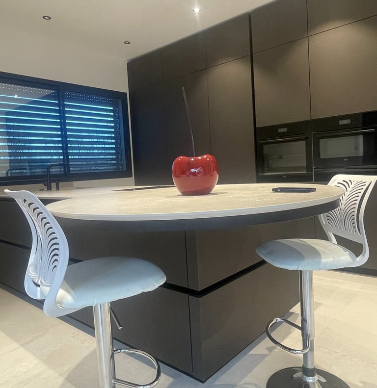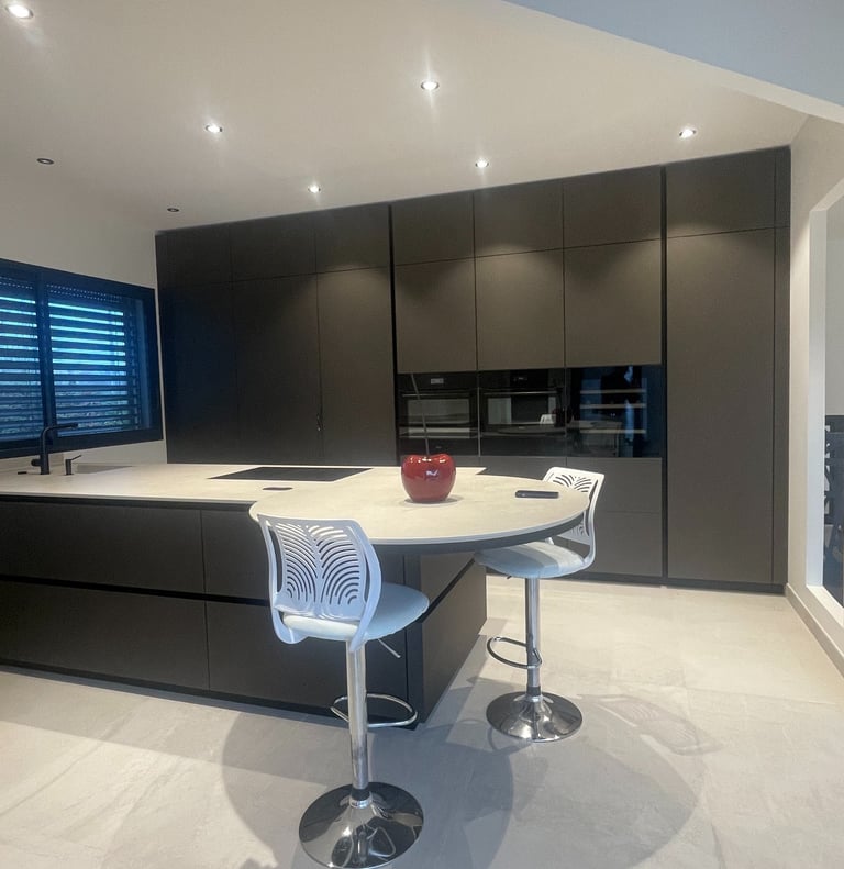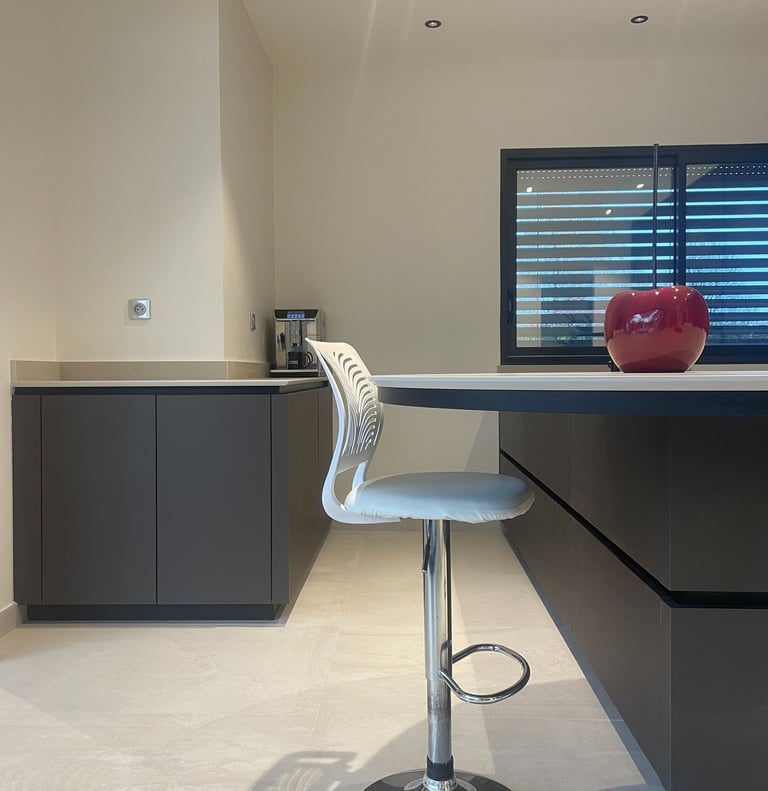 Cette cuisine contemporaine associe sobriété des lignes, élégance du noir mat et raffinement des matériaux. L’îlot central, pensé comme un véritable lieu de partage, allie fonctionnalité et convivialité. Chaque détail a été conçu sur mesure pour offrir un équilibre parfait entre esthétique et confort d’utilisation.