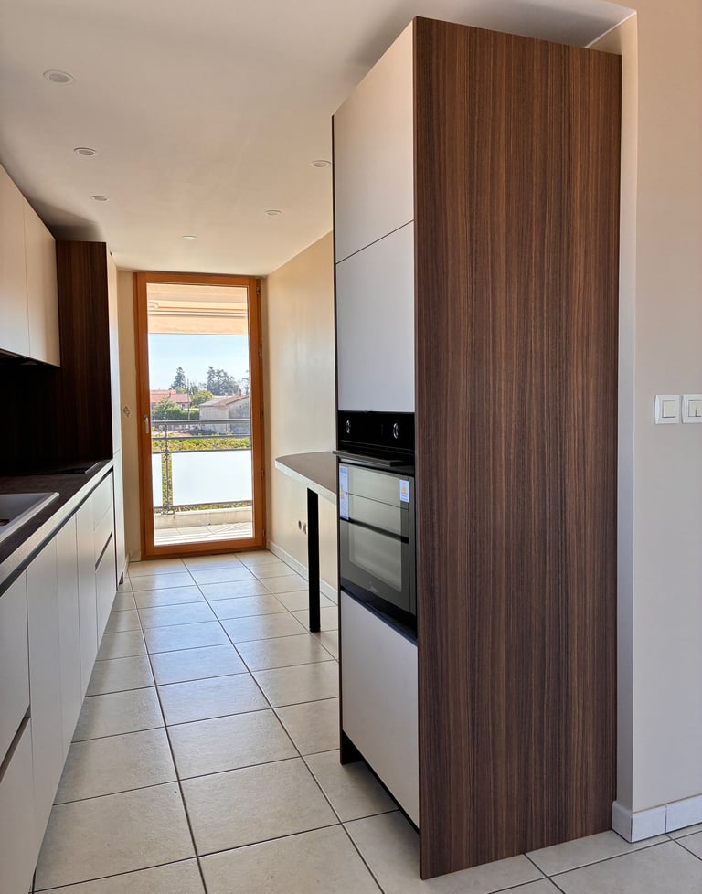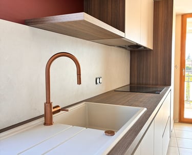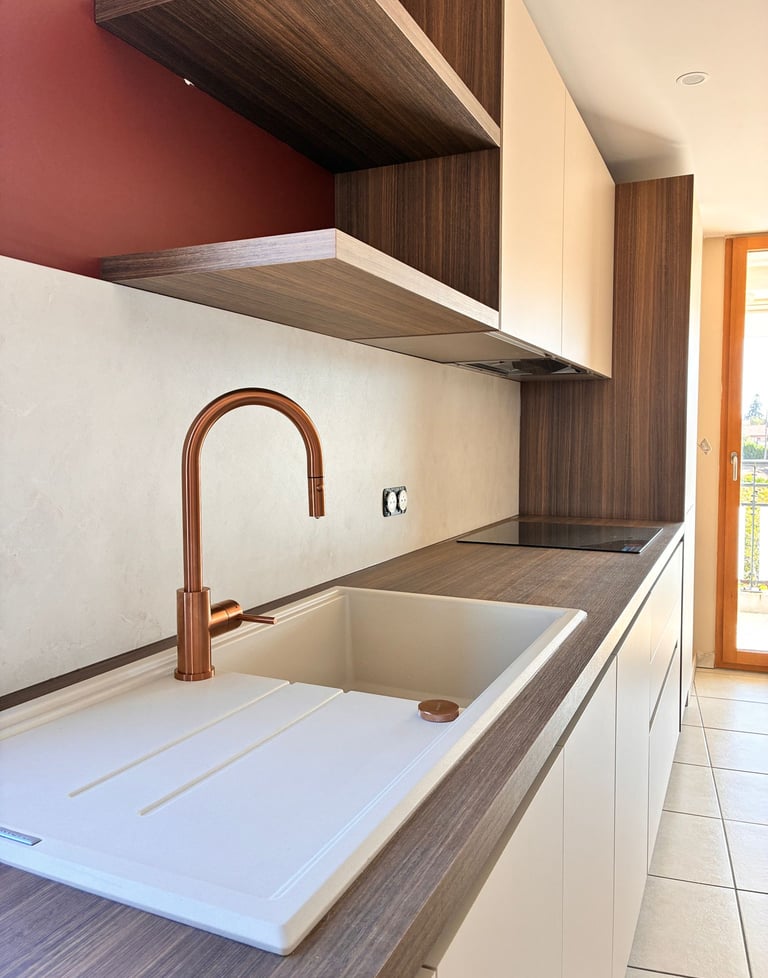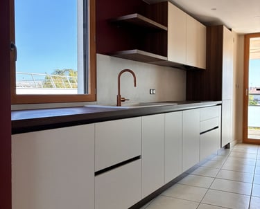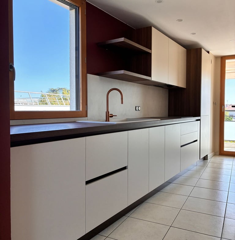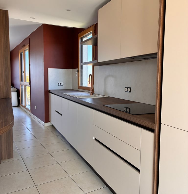 Réalisation d’une cuisine élégante et intemporelle, pensée pour s’intégrer harmonieusement à un espace de vie lumineux et ouvert sur l’extérieur. Nous avons choisi des façades mates couleur coquille associées à un stratifié bois foncé, pour un contraste à la fois doux et raffiné. Le plan de travail effet pierre et la robinetterie cuivrée viennent sublimer l’ensemble par leurs finitions haut de gamme.